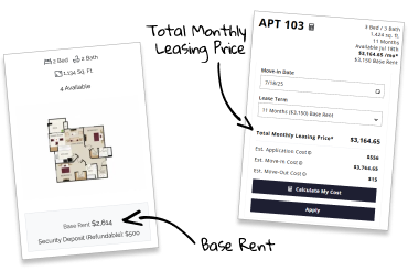 Our goal is to help you plan your budget with ease, enhancing your rental home experience. Prices shown are base rent. To help budget your monthly fixed costs, add your base rent to the Essentials and any Personalized Add-Ons you will be selecting from the list of potential fees which can be found at the bottom of the page.